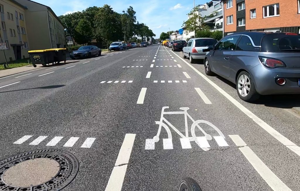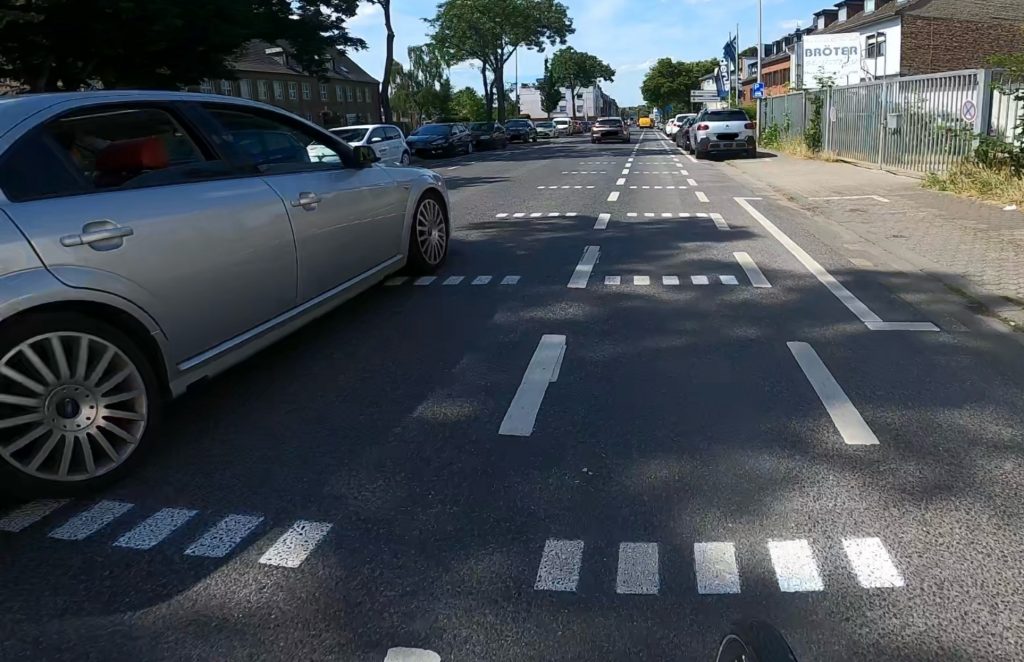 Und zwar auf der Rütger-von-Scheven-Straße, auf der der „Schutz“streifen zumindest mit einem kleinen Trennstreifen zu den Parkzeugen gesichert ist. Dass diese Sicherheitszone zu den parkenden Pkw längst nicht mehr dem heute vorgeschriebenen Mindestmaß (75cm) entspricht, sei hier nur am Rande erwähnt. Genau wie die Tatsache, dass es etliche „Schutz“streifen und „Mehrzweckstreifen“ in Düren gibt, die gar keine Sicherheitszone haben, dafür aber auch nicht den regulären Mindestbreiten für „Schutz“streifchen entsprechen… 🥳