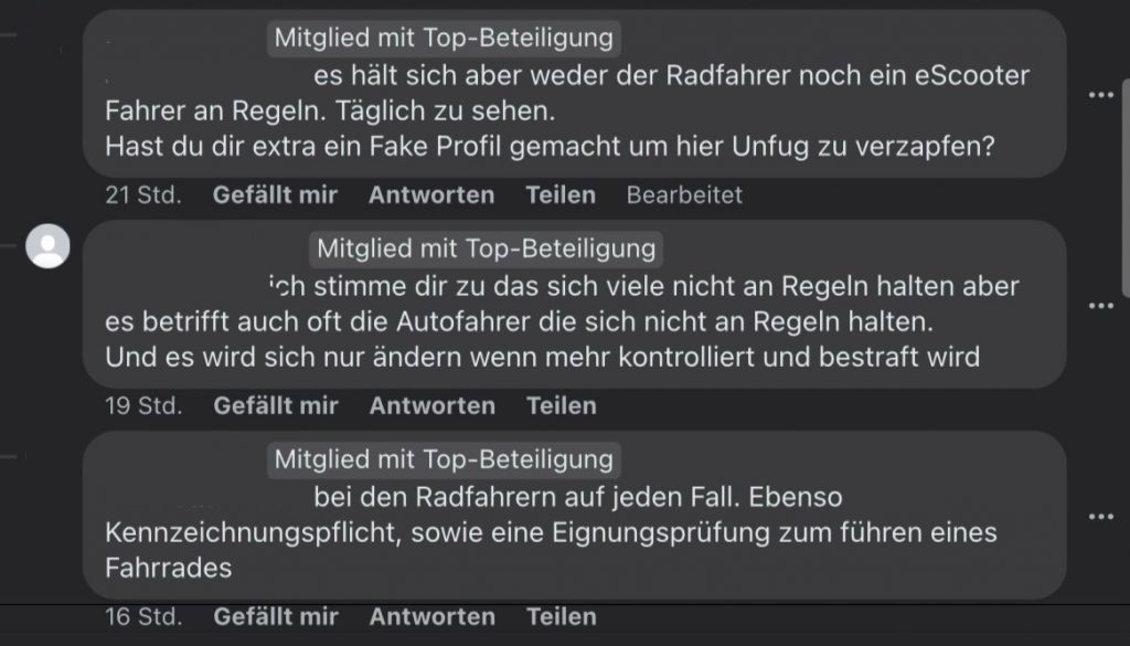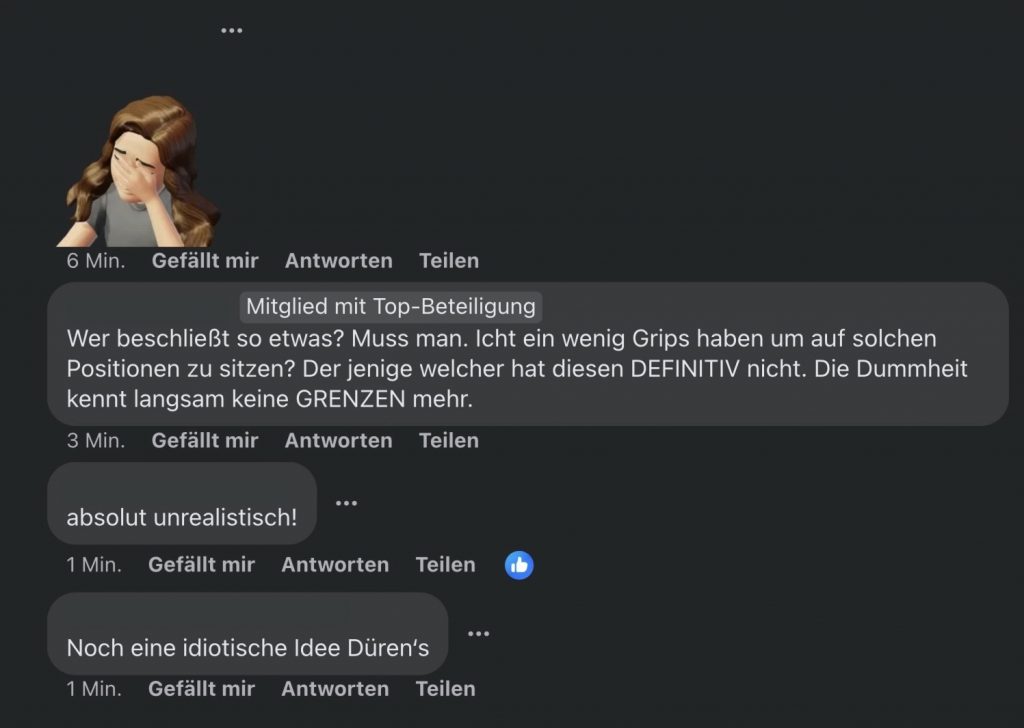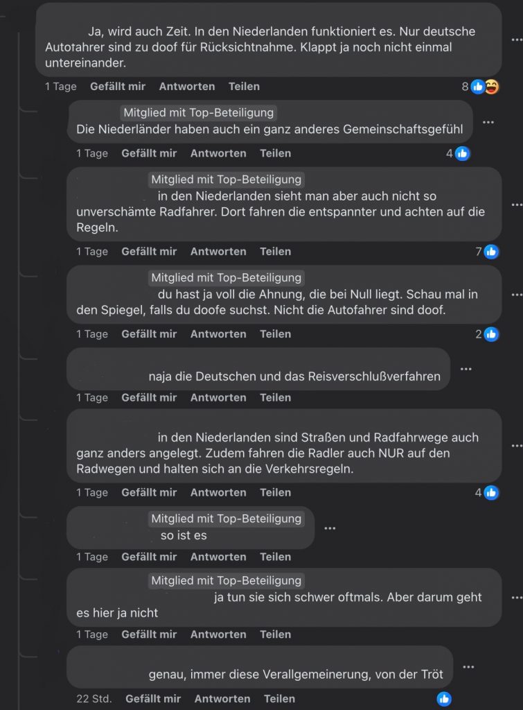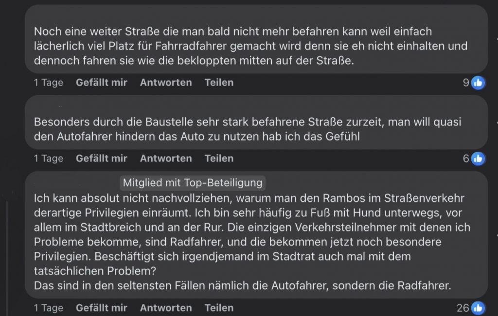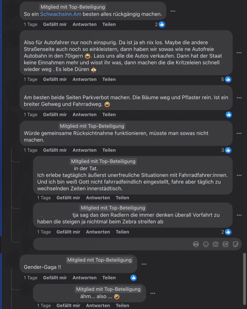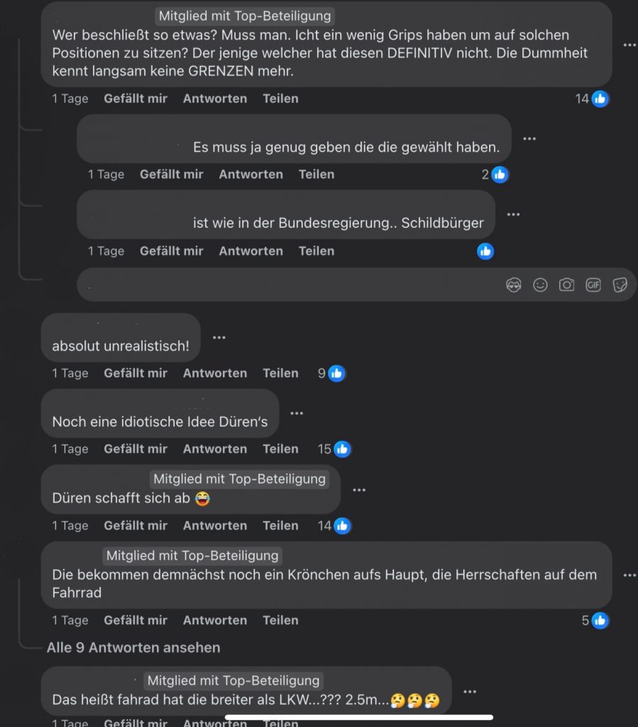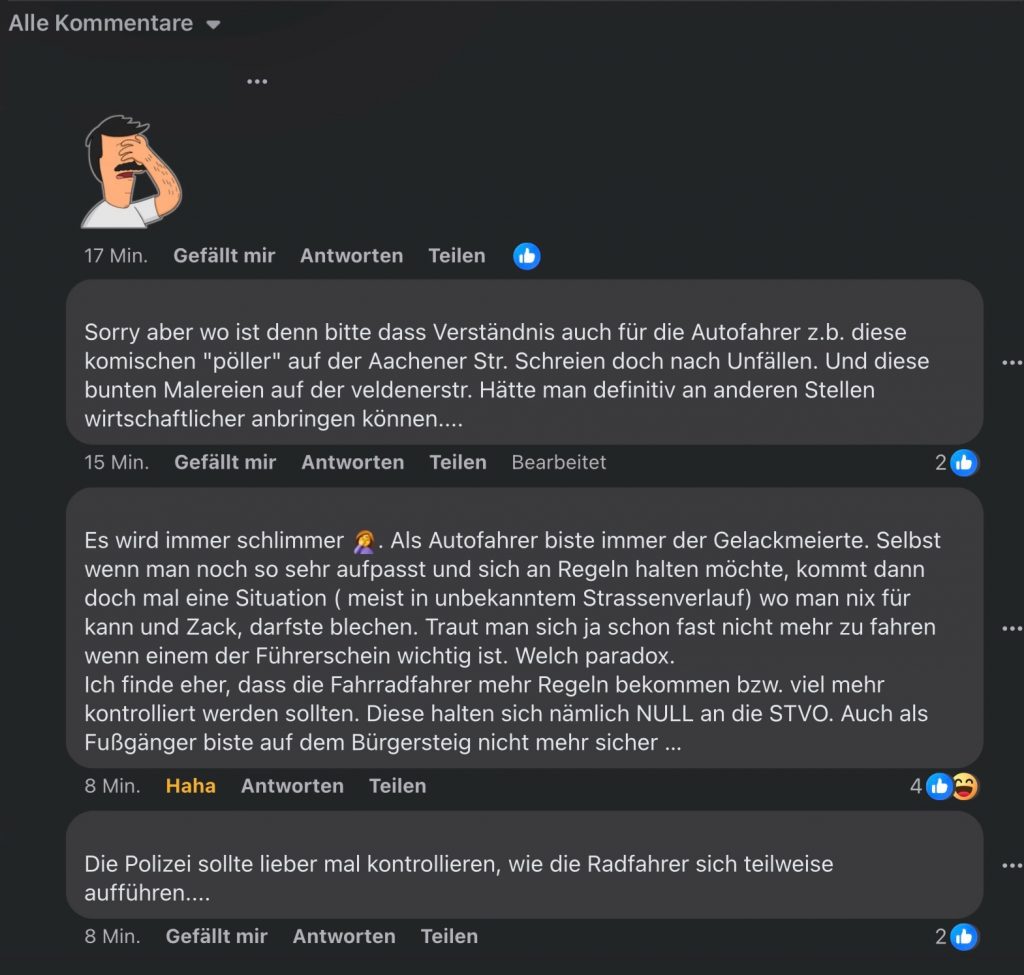 Die Petrol-Heads sind sich dabei nicht zu schade, ihre uninformierte Dummheit mit Forderungen nach mehr Fahrrad-Kontrollen, Kennzeichenpflicht für Fahrräder, Steuern für Radfahrende und sonstige Whataboutisms ohne jeglichen Kausalzusammenhang, öffentlich zur Schau zu stellen. Eigentlich ganz niedlich. Aber nur solange man sich nicht vor Augen führt, welche Folgen die Dummheit, Ignoranz und gelebte Antipathie für die 11-jährige Radalerin auf (bspw.) der Zollhausstraße und all die anderen radelnden Dürener bedeutet.