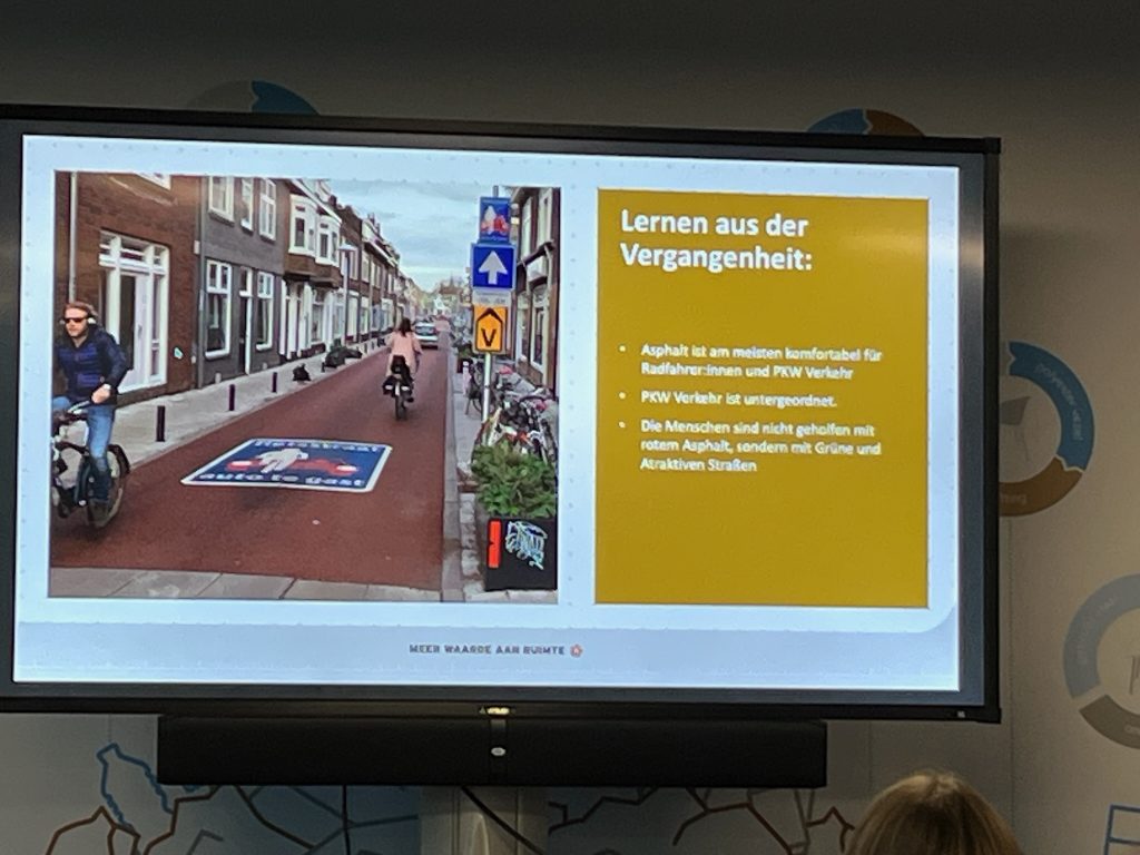 Minimalistisch zusammengefasst: Die deutsch-niederländischen Expert*x erzählten und veranschaulichten genau das, was wir privat und als ADFC & ProRad Düren seit Jahren erzählen und fordern – nochmals hinterlegt mit jeder Menge praktischem Erfahrungswissen, wissenschaftlichen und gemessenen Fakten und so weiter und so fort… Das mag zwar für die eine oder den anderen Exkursions-Teilnehmer*x neu, überraschend oder beeindruckend gewesen sein. Als Rad-Lobby-Vertreter alles ziemlich alte Hüte – ohne das in irgendeiner Form den vortragenden Expert*x gegenüber abwertend zu meinen! Ganz im Gegenteil. Wir mussten uns dank der Vorträge und Expertise zwangsläufig extrem in unserer Arbeit bestätigt fühlen, waren aber wohl weniger „überwältigt“ von den niederländischen Ansätzen in Sachen innerstädtischer Verkehrsplanung.