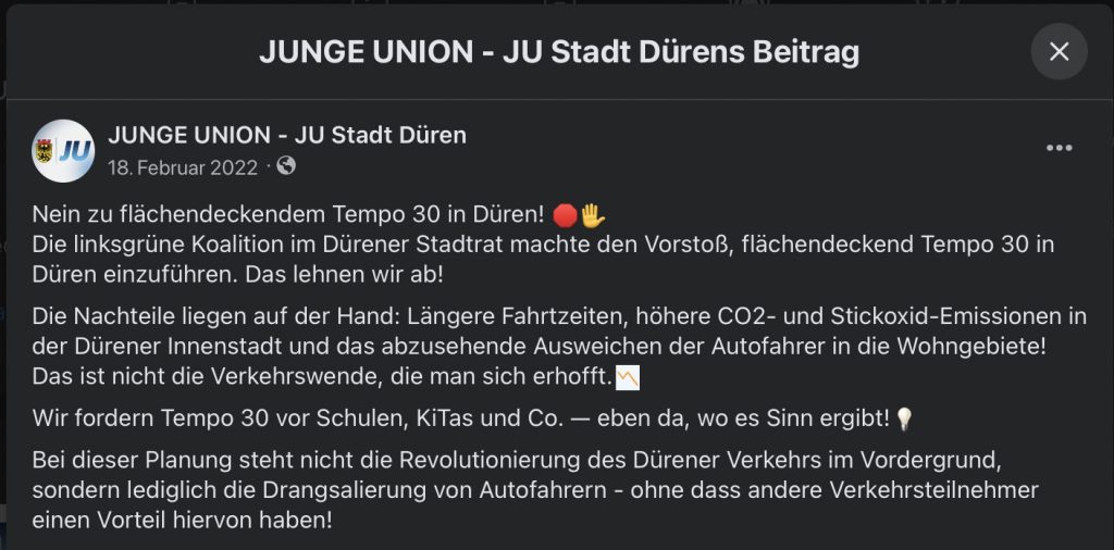 Der Nachwuchs des CDU-Stadtverbandes, die Junge Union Düren, toppt das mit einer bewussten Falschinterpretation und versuchten Öffentlichkeitstäuschung in Sachen tödliches Tempo 30. Blindlings im ideologischen Fahrwasser ihres Stadtverbandes mit schwimmend postet sie bei Facebook: