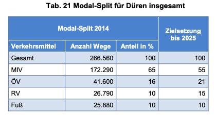 Zum einen sollen insgesamt mehr Wege mit den Verkehrsmitteln des Umweltverbundes zurückgelegt werden. Zum anderen sollen auch die mit dem Umweltverbund zurückgelegten durchschnittlichen Entfernungen erhöht werden. Beides ist allerdings ausschließlich als Verlagerungsstrategie vom MIV zum Umweltverbund zu sehen und soll nicht zu einer Steigerung des Verkehrsaufwandes insgesamt führen. Die Zielsetzung gilt dabei sowohl für den Quell- und Zielverkehr von und nach Düren als auch für den Binnenverkehr in Düren. Als Zielhorizont wird das Jahr 2025 vorgeschlagen. Sowohl bei Quell- und Zielverkehr als auch beim Binnenverkehr sollen bis zu diesem Zeitpunkt mindestens 10% des MIV-Anteils auf den ÖV und den Radverkehr verlagert werden. Darüber hinaus soll ein weitergedachtes, langfristiges Ziel aufgestellt werden, welches im Rhythmus der Zielneuformulierung (ggf. alle 10 Jahre) an neue Entwicklungen und Möglichkeiten angepasst wird.“