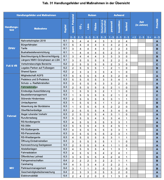 „Um eine fahrradfreundliche, flächenhafte Erschließung zu erreichen, ist eine durchgängige Sicherung des Fahrradverkehrs auf Verkehrsstraßen (Radverkehrsanlagen) und Erschließungsstraßen (Tempo 30-Zonen, Fahrradzonen, Verkehrsberuhigte Bereiche, Fahrradstraßen, geöffnete Einbahnstraßen etc.) zu gewährleisten. (…) 7.2.4.1 Kurzfristige bis mittelfristige Maßnahmen (Planung und bauliche Umsetzung) Zum kurzfristigen und mittelfristigen Realisierungskonzept sind Maßnahmen zuzuordnen, die in den nächsten Jahren geplant und baulich umgesetzt werden können. Hierzu zählen in erster Linie markierungs- und beschilderungstechnische Maßnahmen, wie beispielsweise bei der Umsetzung von Fahrradstraßen. Darüber hinaus können auch kleinere bauliche Maßnahmen mit geringem Aufwand dem kurzfristigen Maßnahmenkonzept zugeordnet werden. Ebenso sind Maßnahmen zur deutlichen Erhöhung der Verkehrssicherheit und ggf. in Kombination mit bereits vorgesehenen Kanalsanierungen in das kurzfristige Realisierungskonzept mit einzubeziehen. Ziel sollte es insb. auch sein, größere zusammenhängende Abschnitte von Rad-Vorrang-Routen oder sogar ganze Routen umzusetzen, um Erfolge präsentieren und eine Qualitätskontrolle durchführen zu können. In diesem Zusammenhang können folgende Teilabschnitte bzw. Rad-Vorrang-Routen dem kurz- bis mittelfristigen Maßnahmenkonzept zugeordnet werden: