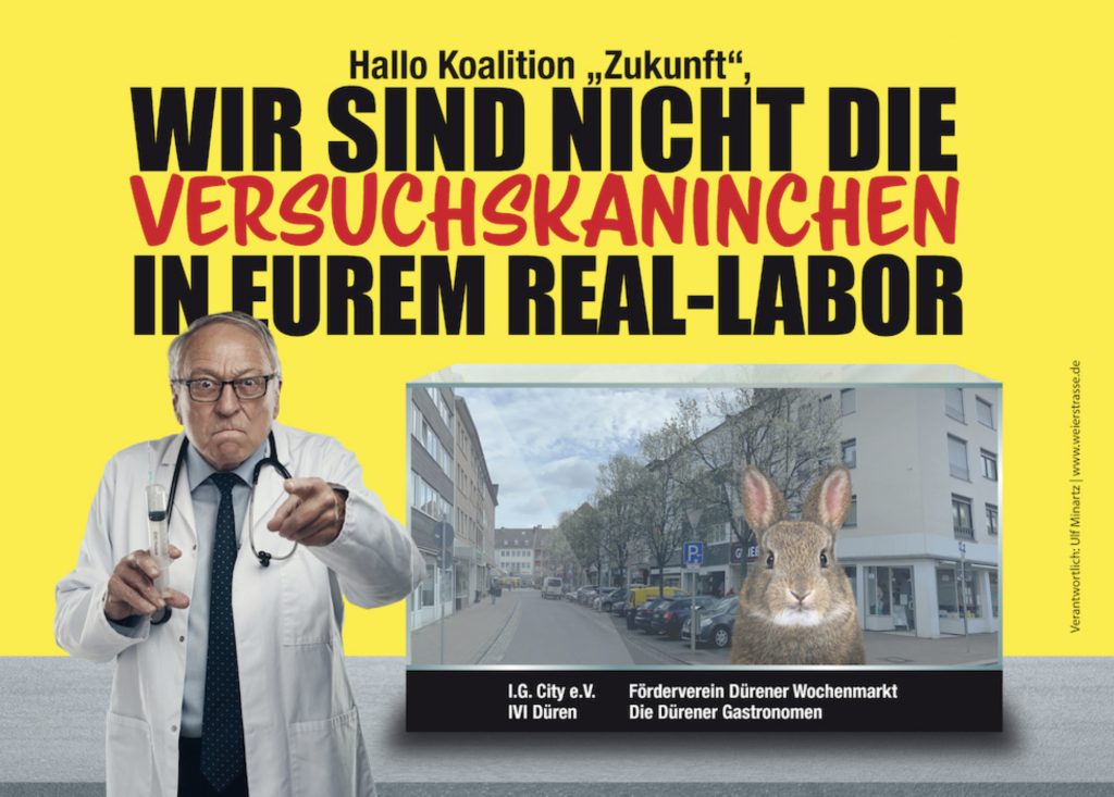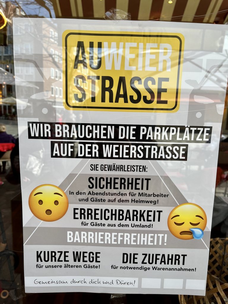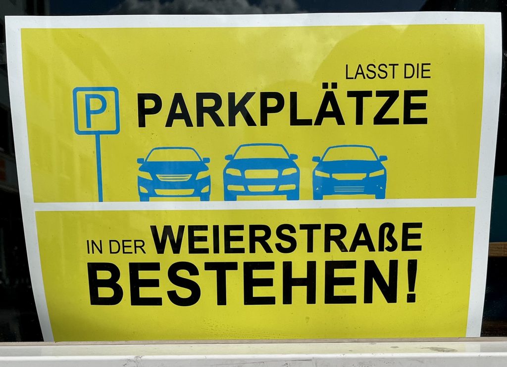 Der Mythos vom guten Parkplatz lebt weiter! Während es der Koalition nicht gelungen ist, rechtzeitig und ausreichend “die Leute mitzunehmen” in Sachen lebenswerte Stadt und Verkehrswende, hat es die “Initiative Weierstraße” innerhalb weniger Wochen geschafft, “die Leute” davon zu überzeugen, dass von 12-15 Parkplätzen das gesamte Wohl & Übel der Innenstadt abhängt. Dazu waren kaum mehr als ein paar Poster, ein paar aktivierte Netzwerke und ein angedrohtes Bürgerbegehren notwendig. Alle Achtung.